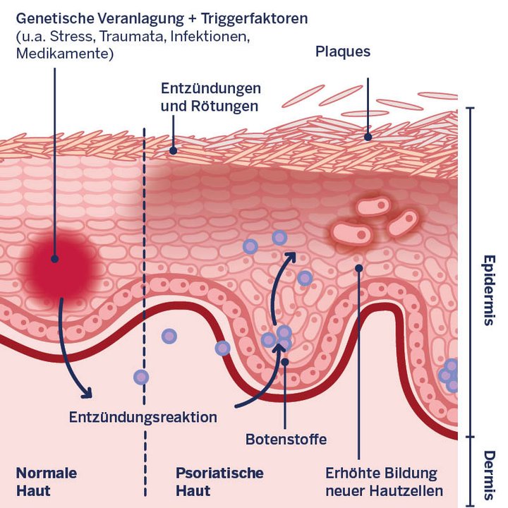Immunsystem: Trifft eine entsprechende Erbanlage auf die persönlichen Triggerfaktoren, kommt es zu den typischen Symptome der Schuppenflechte (Psoriasis). Sie entstehen aufgrund einer „falsch programmierte“ Reaktion des Immunsystems. Dabei verwechselt der Körper seine natürlichen Hautzellen mit schädlichen Proteinen. Das Immunsystem schüttet daraufhin Botenstoffe aus, die veranlassen, dass der Körper seine eigenen Zellen angreift und eine Entzündungsreaktion triggert. Diese Entzündung sorgt dafür, dass sich die Haut rötet, zu jucken beginnt und extrem viele neue Hautzellen bildet. So entstehen die typischen Hautschuppen (Plaques).